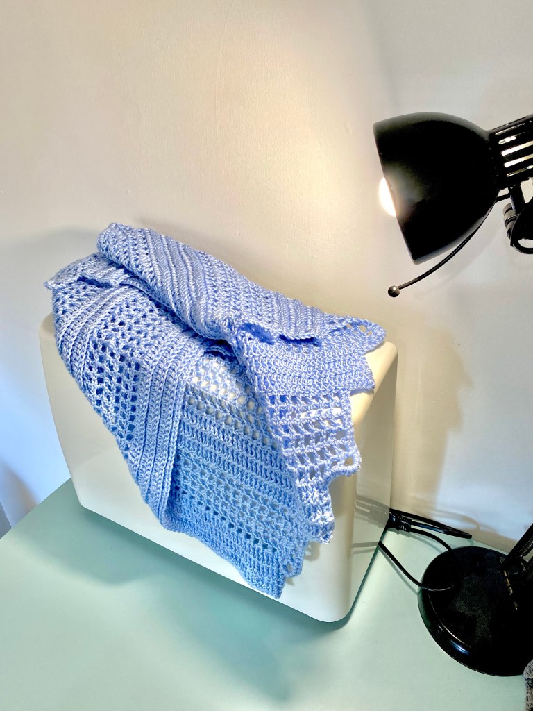 the yarn… It’s a decent price at £4.50 per 100g skein, and at the time of writing is in a 3 for 2 sale, so is worth stocking up on it for the larger projects. It slips nicely on a metal hook (no hook squeek) but it did fray easily and there were times where I found myself adding the twist back into it as the shawl was being made.