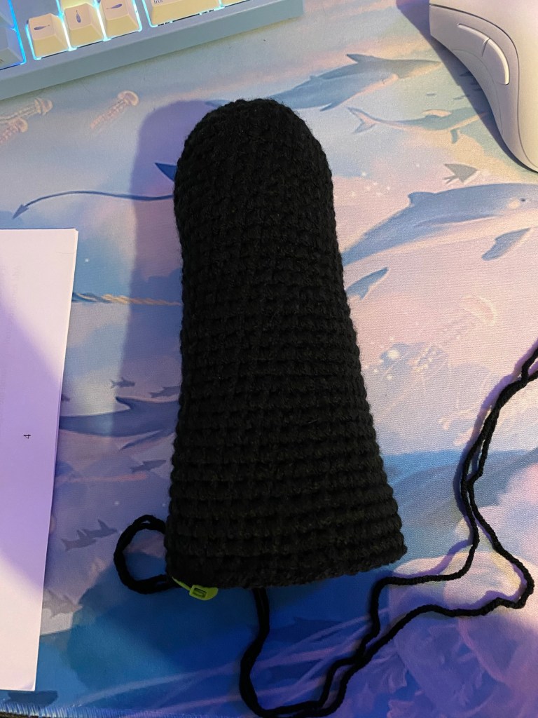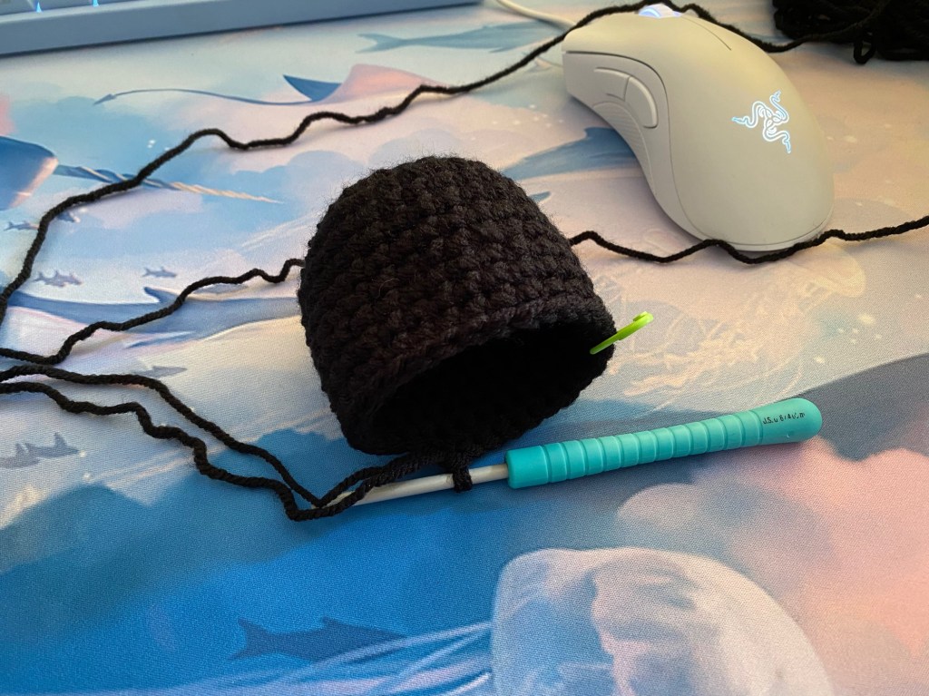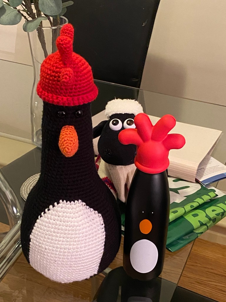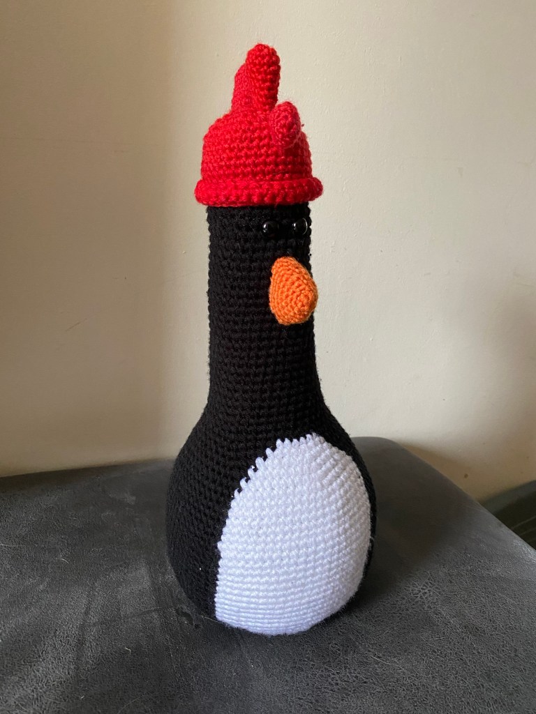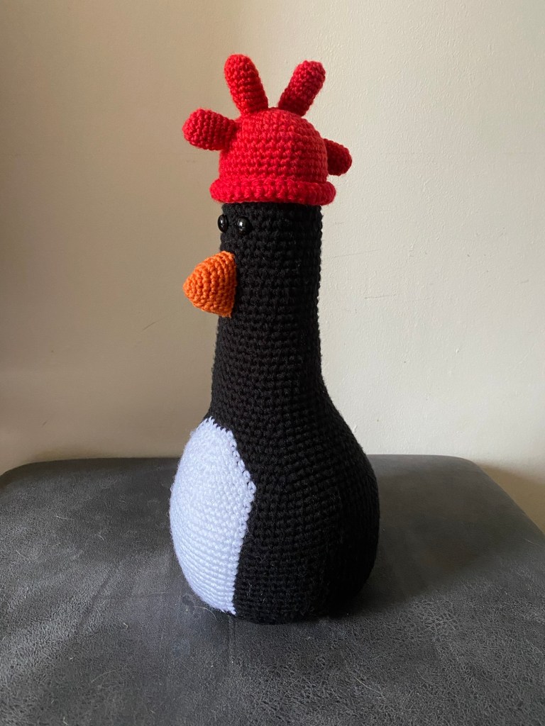 Honestly, I did everything wrong for this pattern, I didn’t use Aaron weight I used two strands of DK, I made it in black not brown, I colour changed the white penguin stomach on the fly (I was so sick of the colour changes by the end), I fudged together feather’s squashed pyramid beak and I used bits of the comb instructions and the start of the body to make the red rubber glove Feather’s wears on his head to disguise himself as a chicken.
