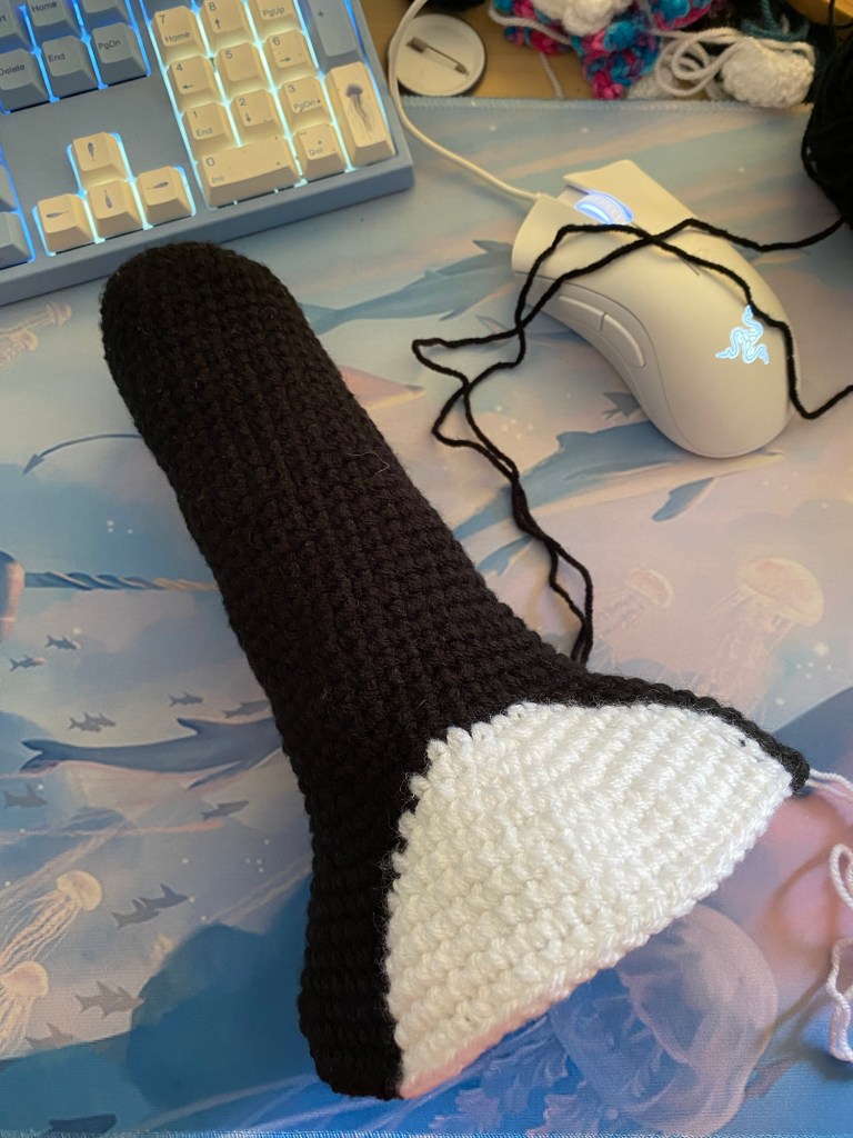 Would I do anything differently if there was a next time? Yes, because of the nature of circular crochet, the vertical rows of crochet lean at a diagonal. I had forgotten that (it’s been a while since I free formed stuff) so next time I would make sure to balance the white stomach properly taking the diagonal into consideration. An entire bag of hobbycraft polyfill stuffing and 500g of weighted plastic beads went into this… I needed more stuffing, especially in the long neck and head. (There’s a theme of under stuffing in my toys, clearly!) lastly I would probably locate the beak and eyes a bit higher up the head and neck so that the rubber glove sat higher and could be taken off to make the door stop look like Feathers when he was a penguin. I played it safe and left room for the glove to fit snugly to avoid it falling off.