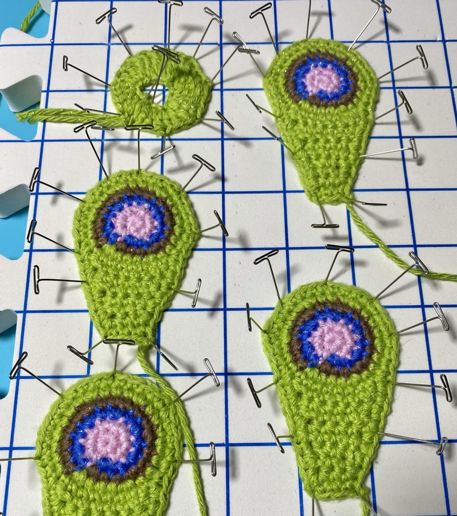 Once everything was blocked it was a relatively simple matter to sew everything together. For the tail I opted to sew the feathers together first in the way I wanted them to sit and then sewed them to the body. The rest of the parts were easily attached like any other crochet toy.